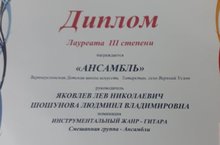 По итогам конкурса Звание Лауреата I степени в номинации «Профессионал» удостоен инструментальный дуэт Киреев В.А., Киреева О.А. Звания Лауреата III степени в номинации «Ансамбль» удостоен ансамбль гитаристов под управлением преподавателей Яковлева Л.Н., Шошуновой Л.В. Выступление наших конкурсантов оценивало жюри в составе Заслуженных артистов России, профессоров Московского государственного института культуры ( г. Москва). Победители награждены памятными медалями и кубком, а также дипломами Лауреатов. Поздравляем преподавателей и ребят!!