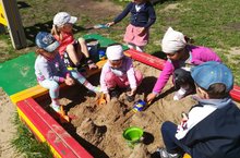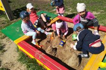 Ребята средней группы каждый день играют в песочнице. Дети строят город, сеть дорог и ездят друг другу «в гости», угощают друг друга «тортиком».