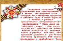 Уважаемые родители! Предлагаем вам присоединиться к акции "Бессмертный полк", которую мы планируем провести в детском саду в мини-формате с детьми в рамках нравственно- патриотического мероприятия " Этих дней не смолкнет слава" . Для этого просим вас прислать на номер ватсап:89393758790, готовые фото( в рамках для тех, кто принимал участие в реальном шествии) прошедших ВОВ ваших прадедушек и прабабушек: Если у вас есть обычные фото из семейных альбомов , мы будем рады их отсканировать в тот же день, когда вы их принесëте ( можно сразу же) и вернуть обратно. Фотографии можно присылать и приносить с 6 мая по 8 мая. Создать фото в оформлении Бессмертного полка можно на сайте https://www.polkrf.ru/shtender . Заранее благодарим вас за отзывчивость!!!