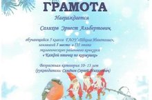 В рамках районного фестиваля детского творчества "Новогодний сундучок" ученик 5а класса ГАОУ "Школа Иннополис" Салихов Э. занял 1 место в экологическом смотре-конкурсе кормушек "Каждой птичке по кормушке"