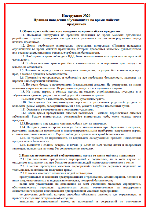 Правила поведения учащихся на майские праздники.