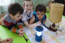 Сегодня наши воспитанники вместе с воспитателем отправились в увлекательное путешествие, где познакомились с предками электрической лампочки и современными ее модификациями. Лучина, свеча, керосиновая лампа, современный светильник удивили и заинтересовали детей своим многообразием форм и способами применения. Во время путешествия дети побывали в импровизированной пещере, где освещали себе путь фонариком на солнечной батарее.
