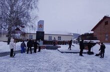 Ребята дружно вышли на уборку снега с площадки у Памятника участникам