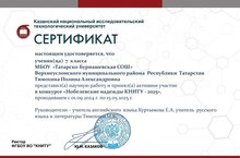 15 мая были подведены итоги XVIII Конкурса «Нобелевские надежды КНИТУ-2025». В нем приняли участие более 1000 обучающихся не только из Республики Татарстан, но и других регионов Российской Федерации. Среди них – ученица 7 класса МБОУ «Татарско-Бурнашевская СОШ» Тимохина Полина. Она стала финалистом первого этапа с исследовательской работой в блоке гуманитарных наук. Желаем дальнейших успехов в научном познании!
