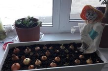 Посадили лук мы в плошки,