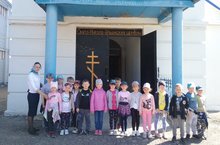 На территории церкви нас встретила Светлана Николаевна, она православный человек, верующий в Бога. Она рассказала детям, как нужно вести себя в церкви, что входить надлежит тихо и благоговейно. Шум разговора, а тем более смех, при вступлении в церковь, оскорбляет святость храма. Рассказала детям об иконах. Показала купель, в которой отец Владимир крестит детей. Показала, где находятся певцы хора во время службы, ведь именно они несут особую службу в храме. Традиция христианского пения очень древняя. Дети внимательно слушали рассказ, потому что для большинства детей эта информация нова. Кто-то из ребят уже посещает церковь со своими родителями, бабушками, а кто-то в первый раз находится в этих стенах.