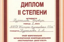 Участница очного этапа Куртымова Варвара, ученица 8 класса МБОУ «Татарско-Бурнашевская СОШ» (руководитель - учитель английского языка Куртымова Е.А.) стала призёром конференции и получила диплом II степени на секции «Филологическая» в возрастной категории учащихся 8-9 классов.