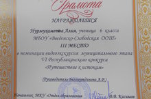 27 октября 2015 года в МБОУ «Введенско – Слободская основная общеобразовательная школа» на общешкольной линейке прошло торжественное награждение грамотой ученицы 6 класса Нурмухаметовой Алии, которая 22 октября 2015 года на базе МБОУ «Октябрьская СОШ» заняла 3 место в номинации «Видеоэкскурсия» муниципального этапа IV Республиканского конкурса «Путешествие к истокам».27нче октябь көнне Введенка Бистәсе төп гомуми белем бирү мәктәбендә укучылар атналык эшләргә нәтиҗәләр ясау линейкасында булды.