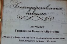 Музыкальный руководитель МБДОУ «Детский сад №15» Гасилина Камила Айратовна получила Благодарственное письмо за участие в концерте, посвященному 190-летию Л.Н. Толстого.