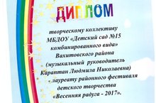 Отдел Управления образования исполнительного комитета муниципального образования города Казани по вахитовскому и Приволжскому районам 28.04.2017 года вручил ДИПЛОМ творческому коллективу МБДОУ "Детский сад №15 комбинированного вида" Вахитовского района (музыкаьный руководитель Л.Н. Караптан)- лауреату районного фестиваля детского творчества "Весенняя радуга-2017".