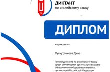Поздравляем! Хуснутдинову Дину Айдаровну, ученицу 11Г класса, призера Всероссийского диктанта по английскому языку среди обучающихся организаций высшего образования и общеобразовательных организаций Российской Федерации. Учитель - Самигуллина Е.Л.