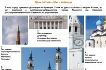В наш город приехала делегация из Франции. У них на руках проспект с видами Казани, но нет подписей к достопримечательностям города. Помогите им. Назовите достопримечательности Казани по их фрагментам.