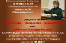 29 января в 11.50 состоится очередное заседание интеллект-клуба «Наша Академия».Лекцию на тему «Архитектура – Пространство – Цивилизация»