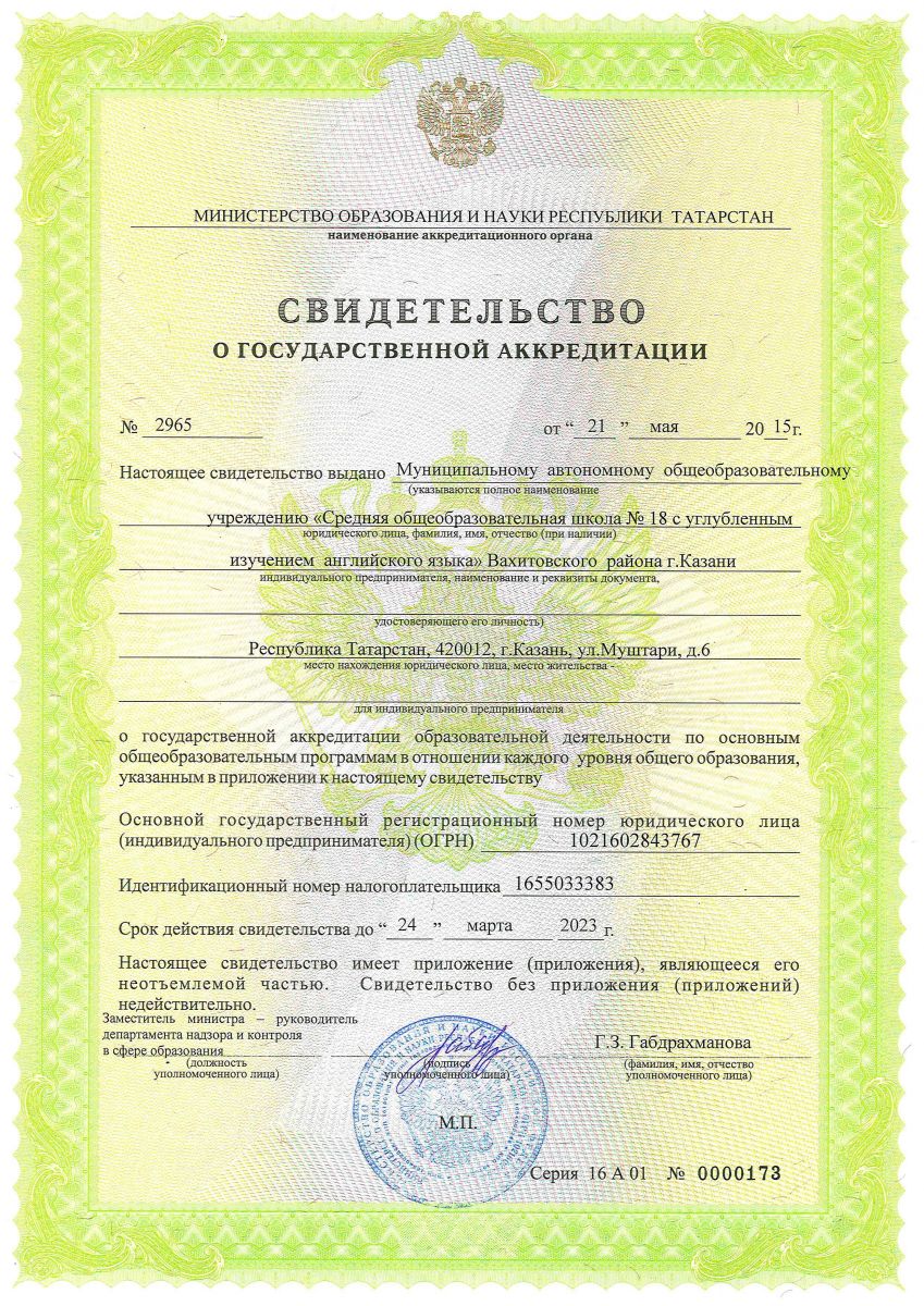 Муниципальное автономное общеобразовательное учреждение «Средняя общеобразовательная школа №18 с углубленным изучением английского языка» Вахитовского района г. Казани