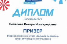 Ученица 9А класса Белялова Венера стала ПРИЗЁРОМ Всероссийского конкурса "Большая перемена"!