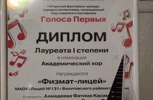 Поздравляем хоровую студию лицея и ее руководителя Ахмадееву Фатиму Касимовну с победой в I Открытом фестивале-конкурсе хоровых коллективов "Голоса Первых"!