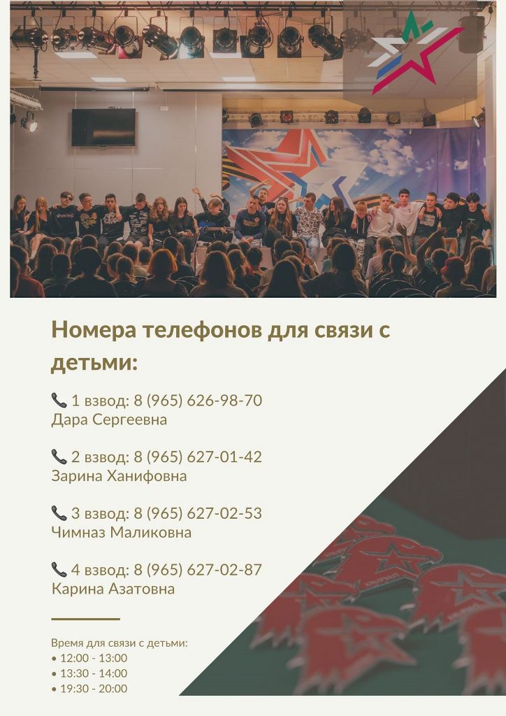 Для связи с детьми, находящимися в данное время в лагере " Патриот" используйте телефоны вожатых.Также вы можете отслеживать информацию и фотоотчеты в группе ВК по ссылке. https://vk.com/rtpatriot