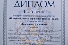 Кадет 9б класса Галиев Динар под руководством учителя истории и обществознания высшей квалификационной категории Хазбиевой Л. И. стал призером Межрегионального конкурса проектов "Истории славные страницы. Школы Героев"