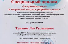16 апреля 2021г. кадет 5а класса Туманов Лев под руководством учителя истории и обществознания Хазбиевой Л. И. принял участие в XIII межрегиональной конференции "Пасхаловские чтения". Его работа "Моя семья - моя награда" была отмечена специальным дипломом "За оригинальность и творческий подход"