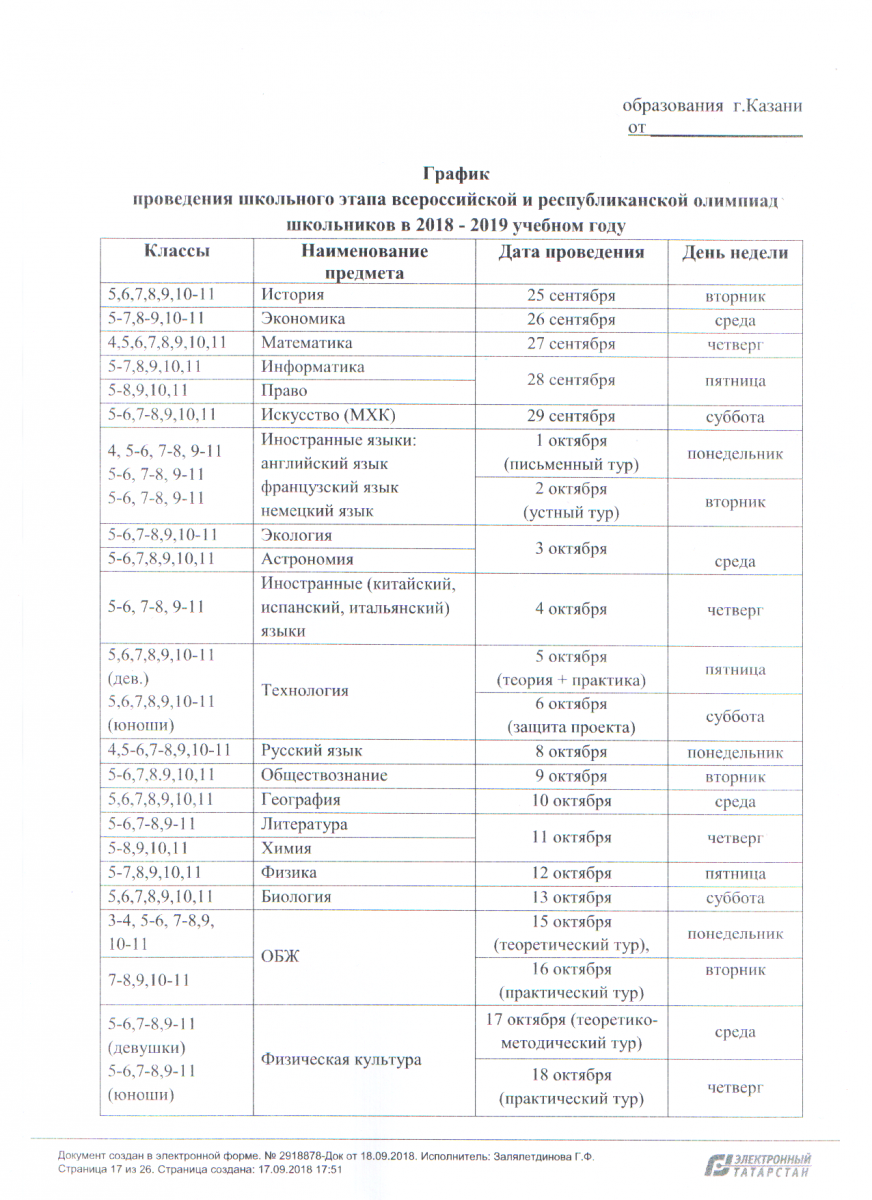 Проткол проведения всероссийской предметной олимпиады школьников в 2018-2019 учебном году.