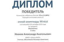 Ученица 4б класса Ксения Николаева стала призёром двух очных олимпиад "WINKID": по математике (учитель Щавлева А.Н.) и по английскому языку (учитель Дроздова Е.А.). Поздравляем Ксению и желаем новых достижений!