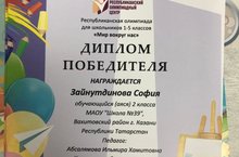 Ученица 2А класса Зайнутдинова София (учитель Абсалямова И.Х.) участвовала в республиканской очной олимпиаде для школьников 1-5 классов «Мир вокруг нас». В мероприятии приняли участие 658 обучающихся с 1 по 5 класс Республики Татарстан.