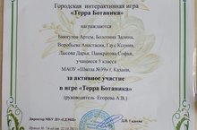 Команда учащихся пятых классов (Гаус Ксения, Панкратова Софья, Болотина Залина, Воробьева Настя Хаярова Вера) приняли активное участие в городской интерактивной игре-конкурсе «Терра Ботаника». Организатором конкурса является Управление образования Исполнительного комитета г. Казани, МБУ ДО «Городской детский эколого-биологический центр». Цель конкурса - популяризация предметов естественнонаучного цикла, актуализация знаний учащихся по ботанике, экологии растений.