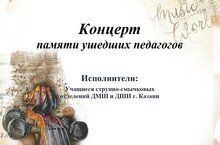 12 декабря в ДМШ им.П.И.Чайковского состоялся концерт "Памяти ушедшим педагогам". Концерт был организован объединённой Городской методической секцией струнно-смычковых инструментов ДМШ и ДШИ г.Казани.