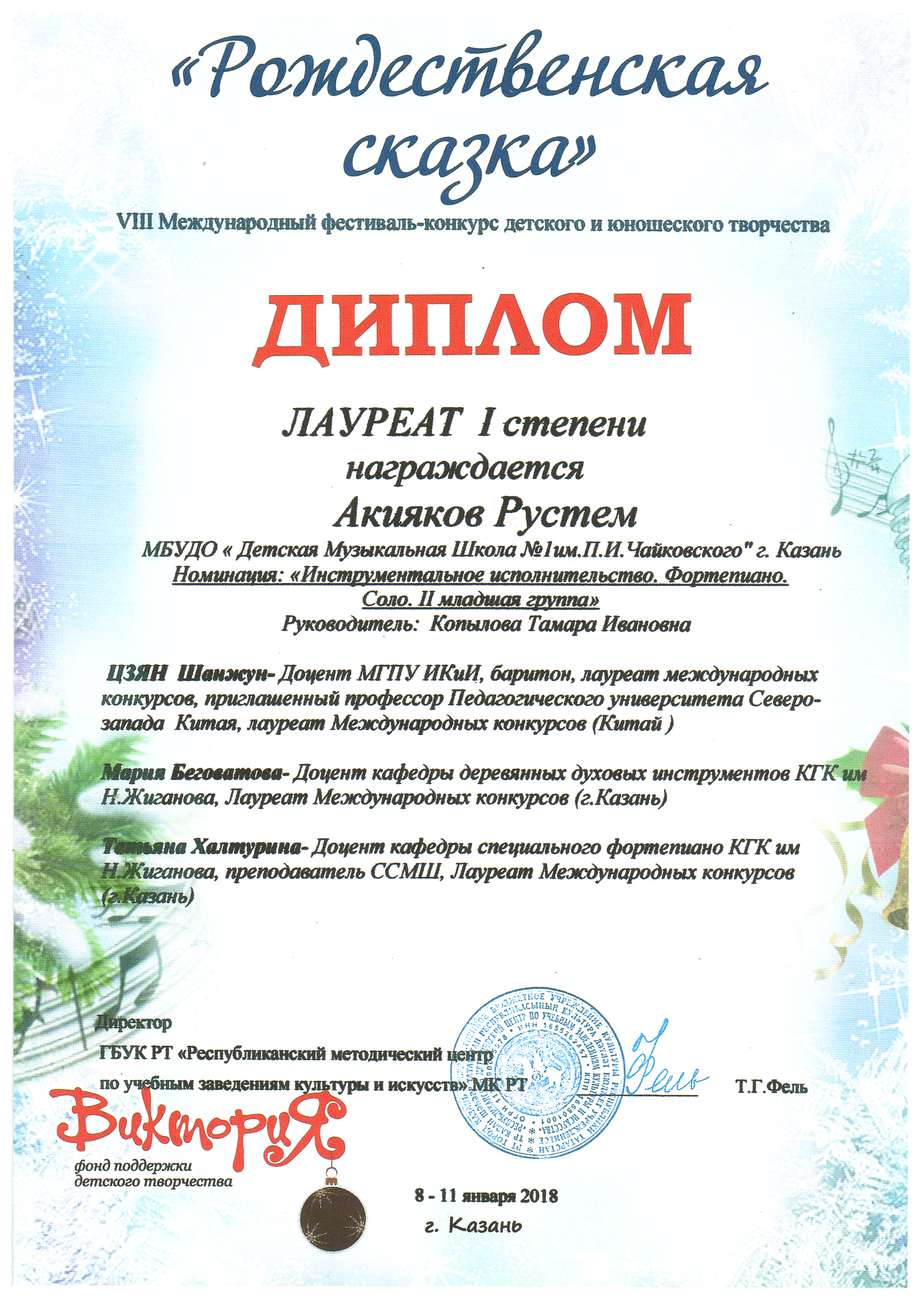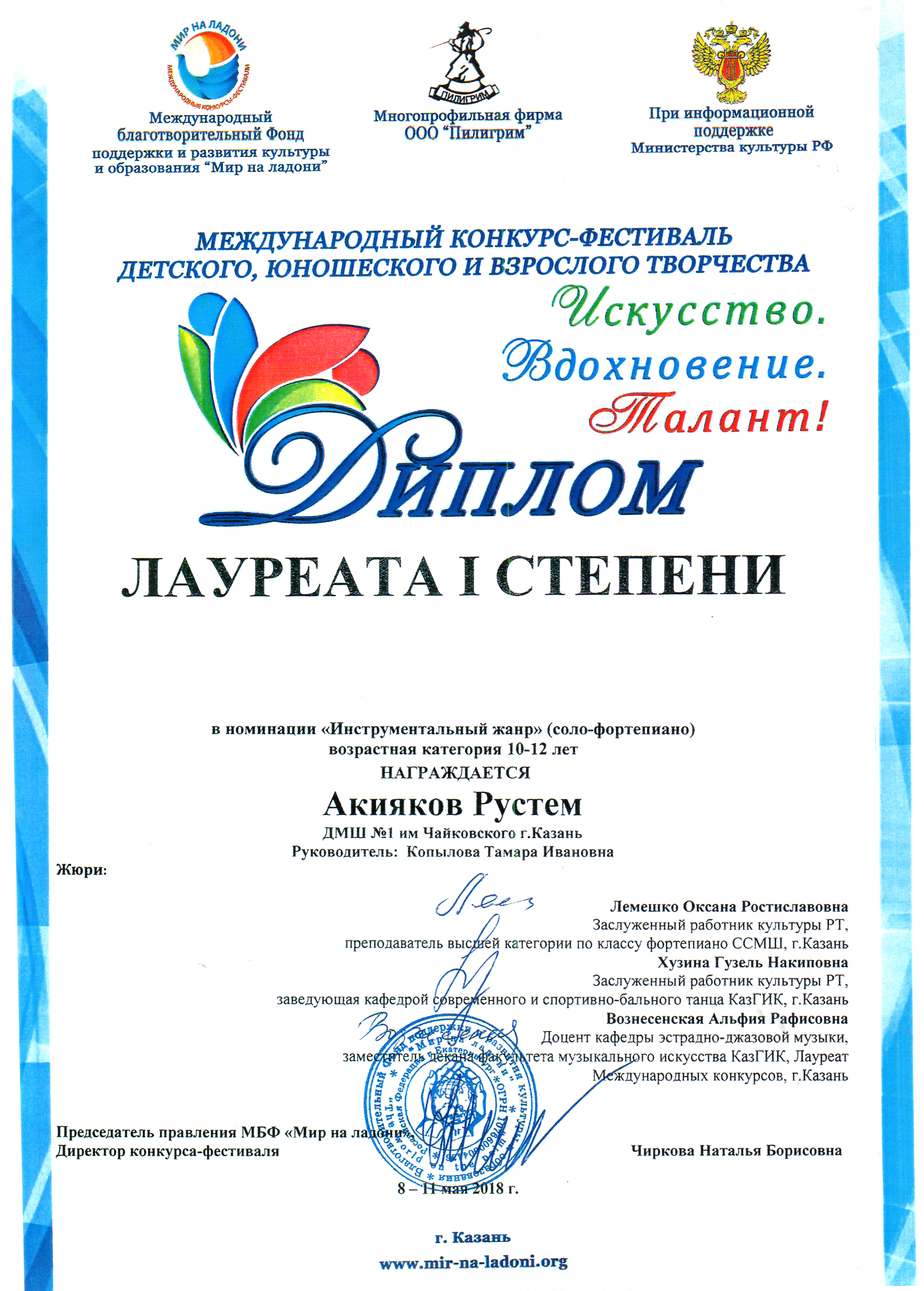 Первый Международный конкурс "Таланты России" - Аитова Алия, Лауреат I степени;