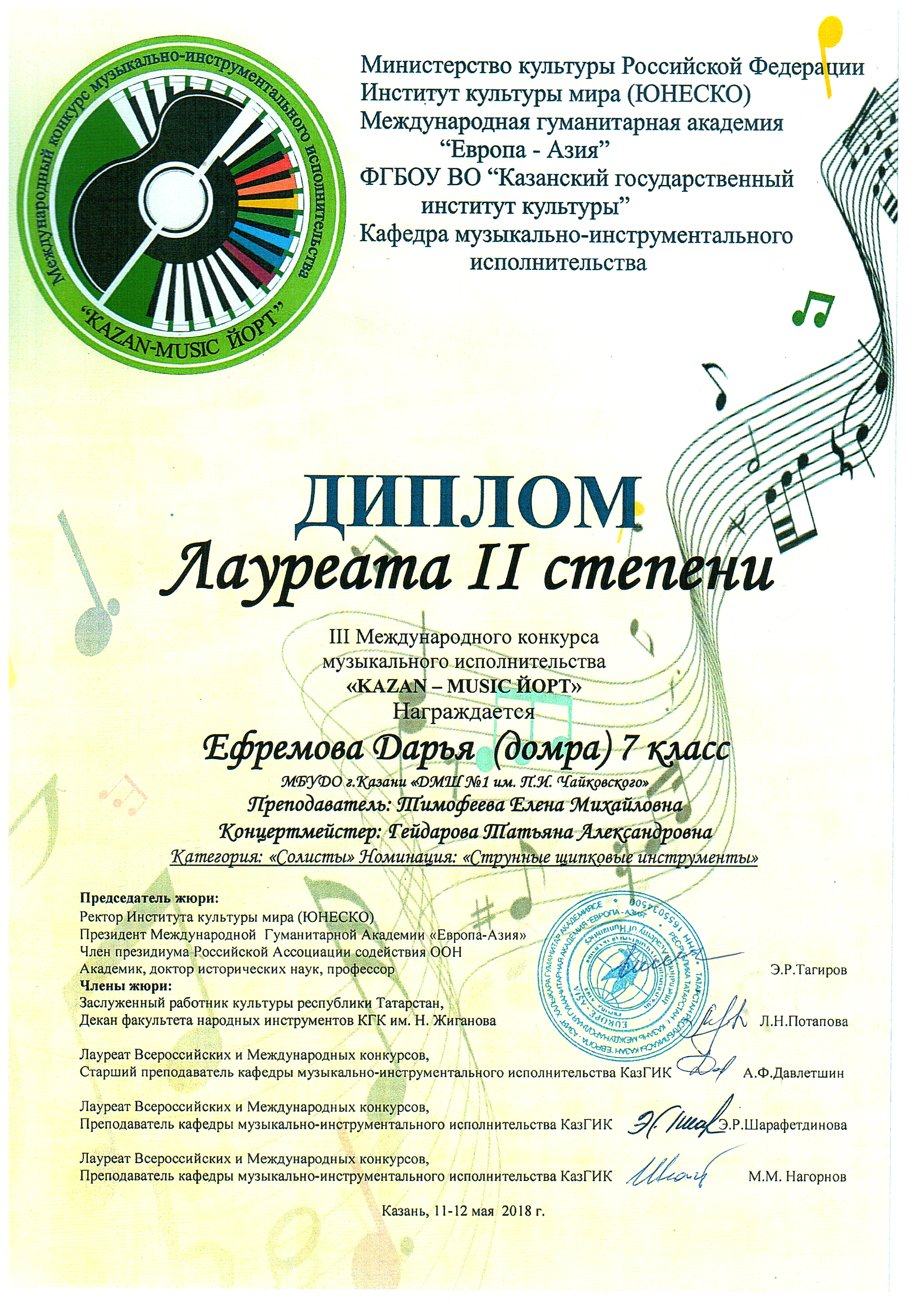 Второй Международный конкурс "Таланты России" - Сингатуллина Эмилия, Лауреат III степени;