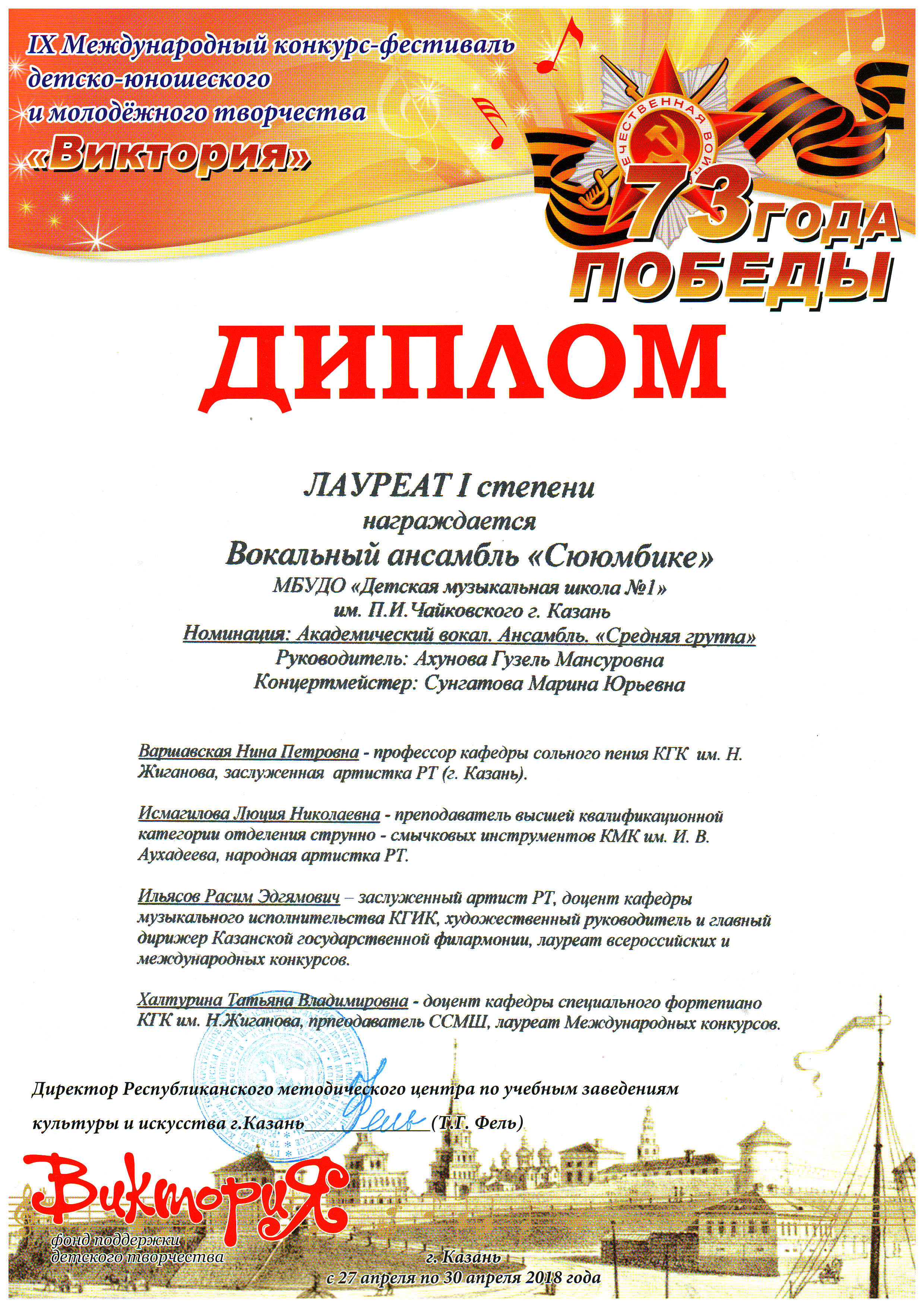 Международный фестиваль-конкурс "Взлёт" - вокальный ансамбль "Сююмбике", Лауреат I степени;
