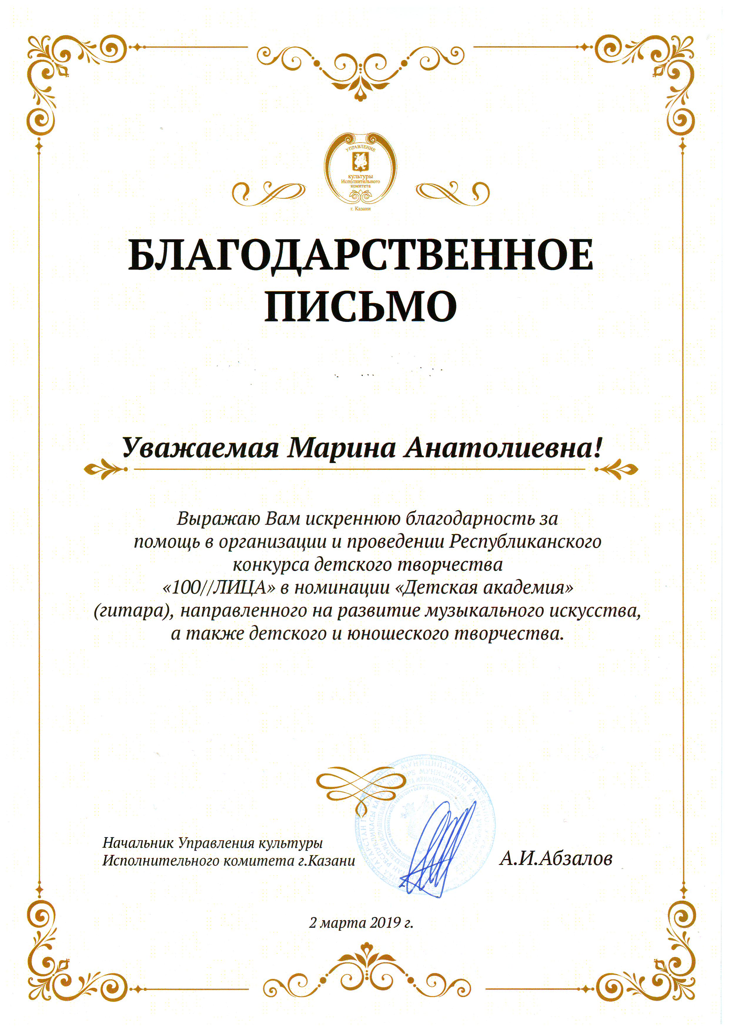 ХV Республиканский конкурс юных исполнителей на домре и балалайке "Звонкие струны" в рамках конкурса детского творчества "100//ЛИЦА"- Благодарственное письмо Абызовой Д.М. за помощь в проведении конкурса;