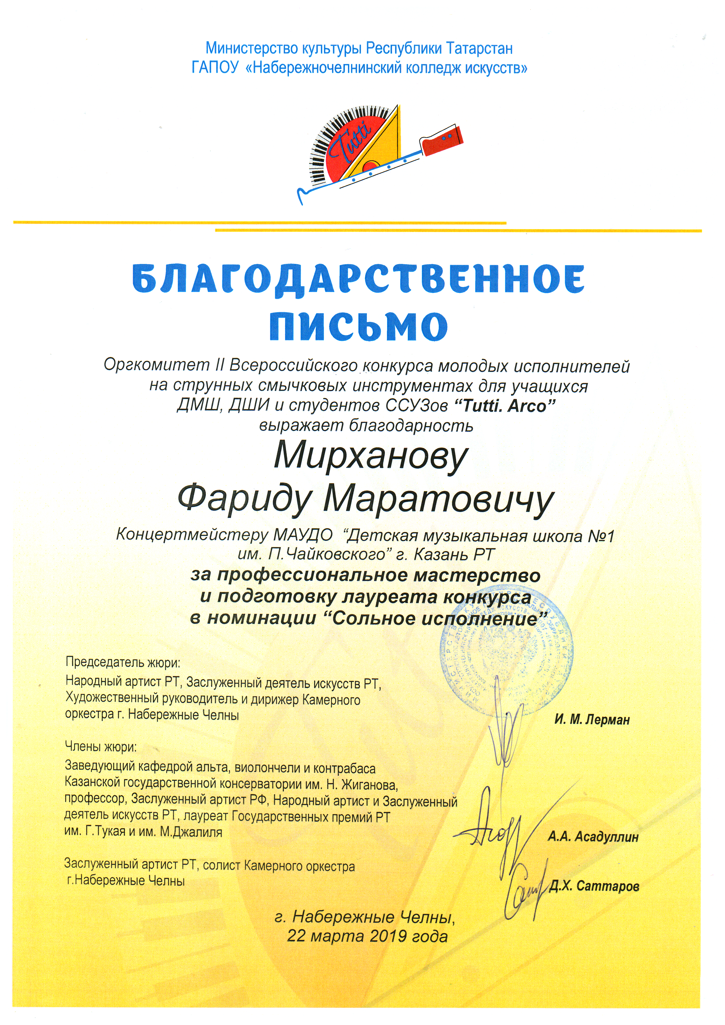 II Всероссийский конкурс молодых исполнителей на струнных смычковых инструментах "TUTTI.ARCO" - Мирханов Ф.М., Благодарственное письмо;