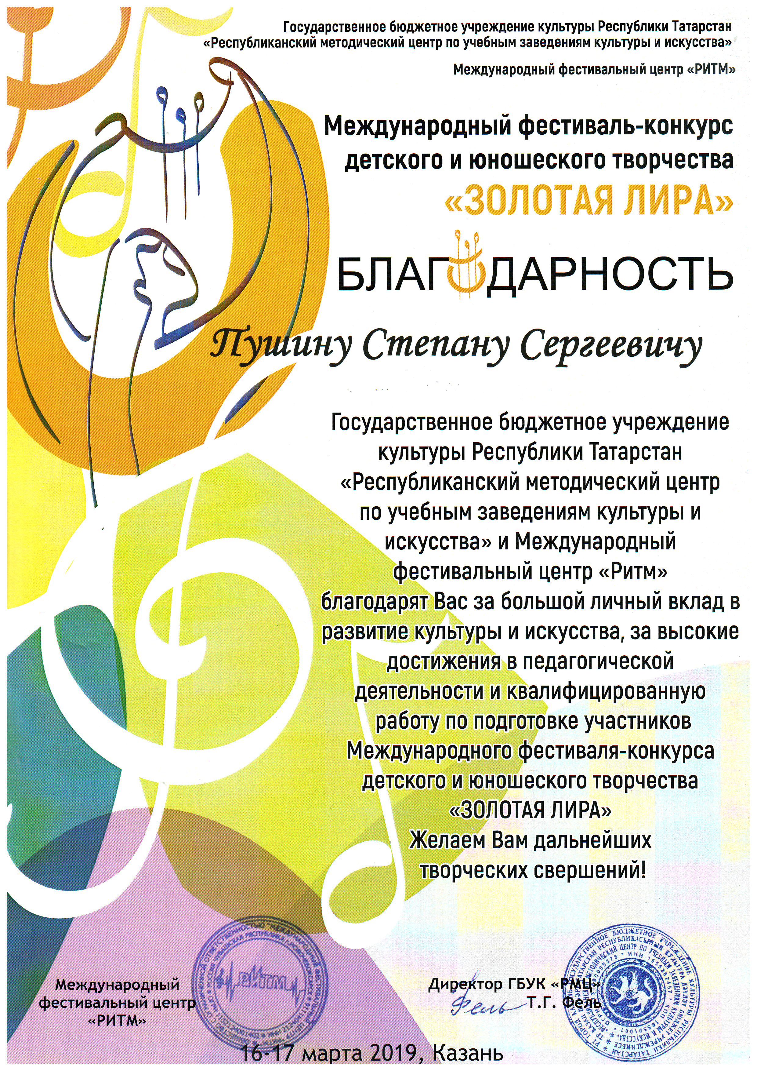 Международный фестиваль-конкурс детского и юношеского творчества "Золотая лира" - Пушин С.С., Благодарность;