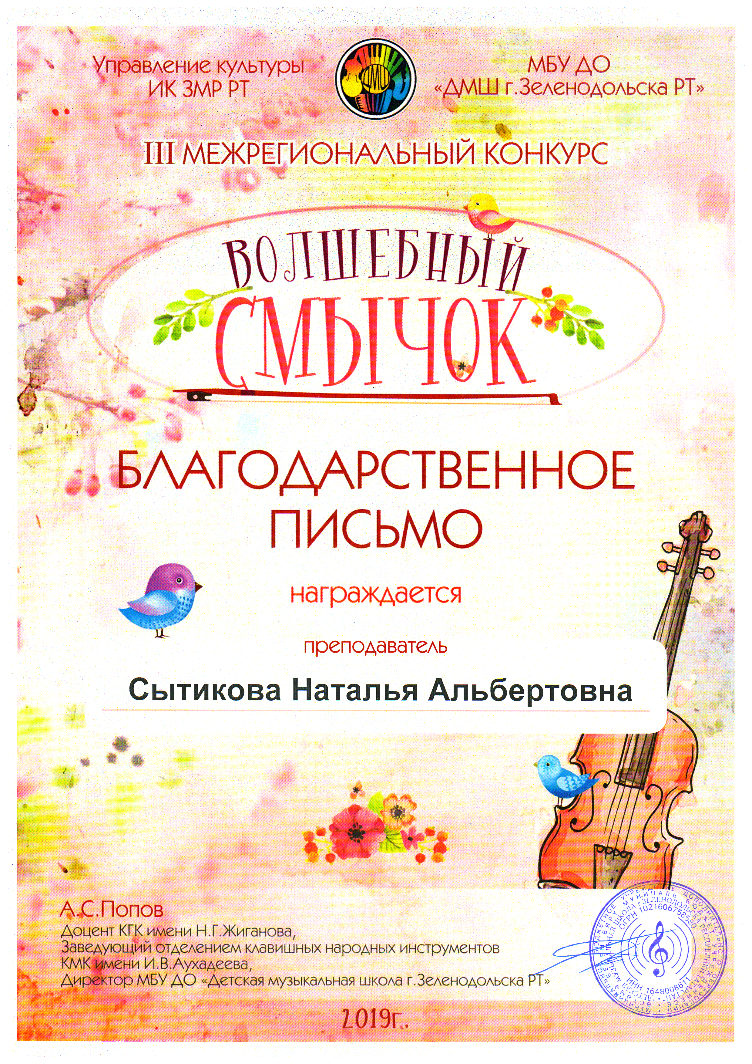 III Межрегиональный конкурс "Волшебный смычок" - Сытикова Н.А., Благодарственное письмо;