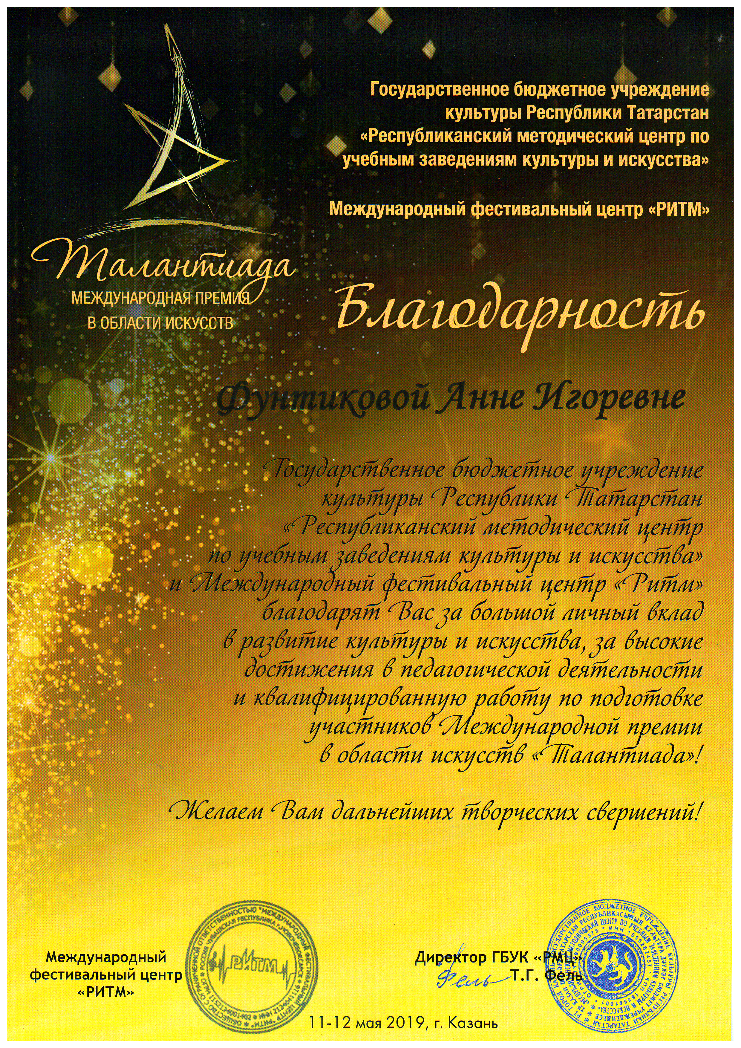 Международная премия в области искусств "Талантиада" - Благодарность Фунтиковой А.И.;
