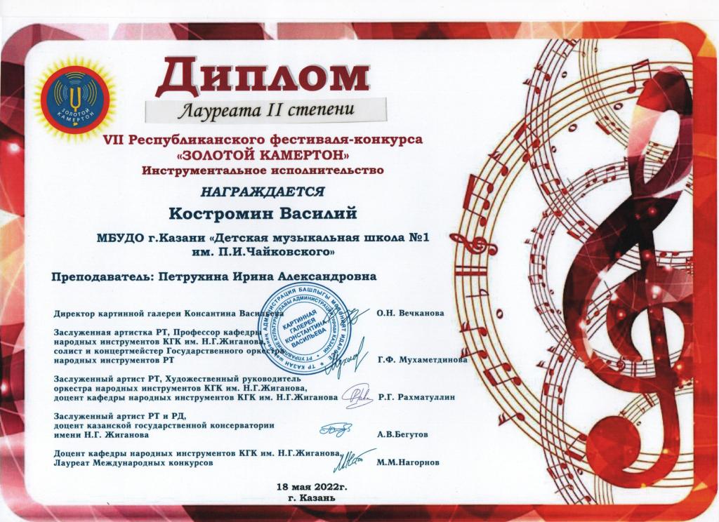 VII Республиканский фестиваль-конкурс "Золотой камертон" - Костромин Василий, Лауреат II степени, класс Петрухиной И.В.;