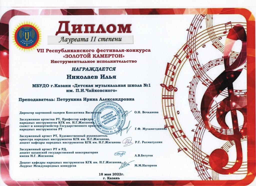 VII Республиканский фестиваль-конкурс "Золотой камертон" - Николаев Илья, Лауреат II степени, класс Петрухиной И.В.;