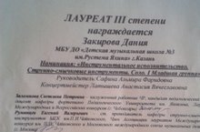 Желаем дальнейших успехов Лауреату III степени Закировой Дание класс преподаватель Сафина А.Ф.