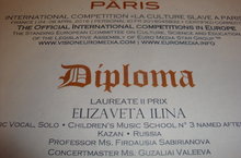 Ученица Сабирьяновой Ф.Г. Ильина Елизавета( концертмейстер Валеева Г.М.) также стала Лауреатом II cтепени вмеждународного интернет-конкурса в Париже. От души поздравляем с достойной победой и желаем покорения ноывх творческих вершин!!!