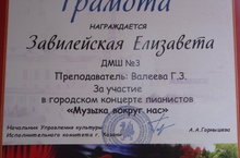 В ДМШ №1 состоялся городской концерт пианистов "Музыка вокруг нас", посвященный году кино. В концерте принимали участие Завилейская Лиза - ученица 5 класса преподаватель Валеева Г.М., исполнившая "Тарантеллу" Мак Доуэлла и Салихов Инсаф - ученик 4 класса преподаватель Яхина Г.Б. исполнивший пьесу "На саночках с горки" композитора Б. Дварионаса