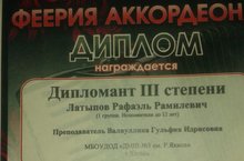 Поздравляем ученика Валиуллиной Г.И. с диполомом III степени III Международного конкурс-фестиваля молодых исполнителей на баяне и аккордеоне, Латыпова Рафаэля.