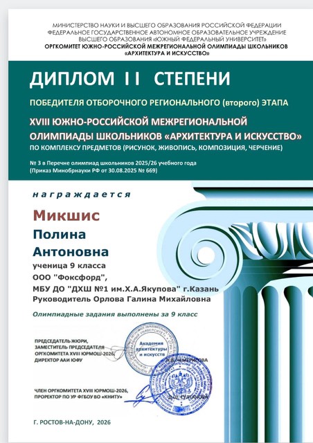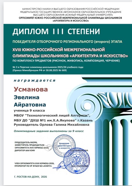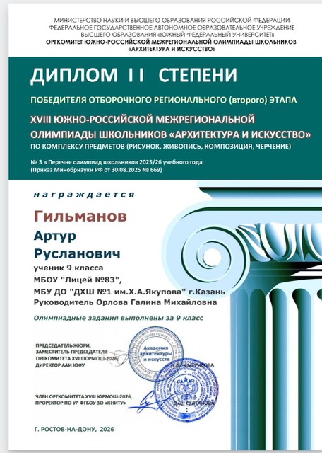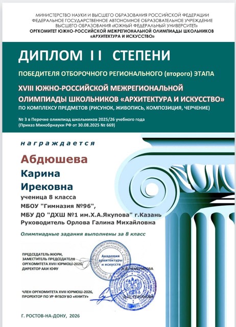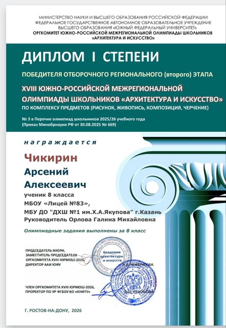 Поздравляем наших ребят и их преподавателя Орлову Г.М. с победой в Региональном этапе XVIII ЮЖНО-РОССИЙСКОЙ МЕЖРЕГИОНАЛЬНОЙ ОЛИМПИАДЫ ШКОЛЬНИКОВ "АРХИТЕКТУРА И ИСКУССТВО" по комплексу предметов (рисунок, живопись, композиция, черчение).