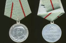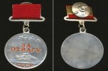 Медаль «За отвагу».Учреждена 17 октября 1938 г. Медаль вручалась за личное мужество и отвагу, проявленные при защите социалистического Отечества и выполнении воинского долга. Награда вручалась военнослужащим армии и ВМФ. Медаль вручалась как правило рядовому и сержантскому составу вооруженных сил, хотя были и случаи награждения офицеров младшего звена. Медалью могли быть награждены лица, не являющиеся гражданами СССР. Медаль изготавливалась из серебра 925 пробы. На аверсе в верхней части изображены три летящих самолёта, ниже помещена надпись «ЗА ОТВАГУ», под которой изображён танк. В нижней части медали размещена надпись «СССР». Все изображения на медали рельефные, надписи вдавленные, покрытые рубиново -красной эмалью. Углубление букв надписей — 1 мм. Аверс медали окаймлен бортиком шириной 0,75 мм и высотой 0,25 мм. Медаль посредством ушка и кольца соединяется с пятиугольной колодочкой, обтянутой шелковой муаровой лентой серого цвета с 2-мя продольными синими полосами по бокам. До 1947 года на медаль наносился серийный номер. Медаль «За отвагу» — 2-ая, после медали «ХХ лет РККА», по времени учреждения в СССР. -