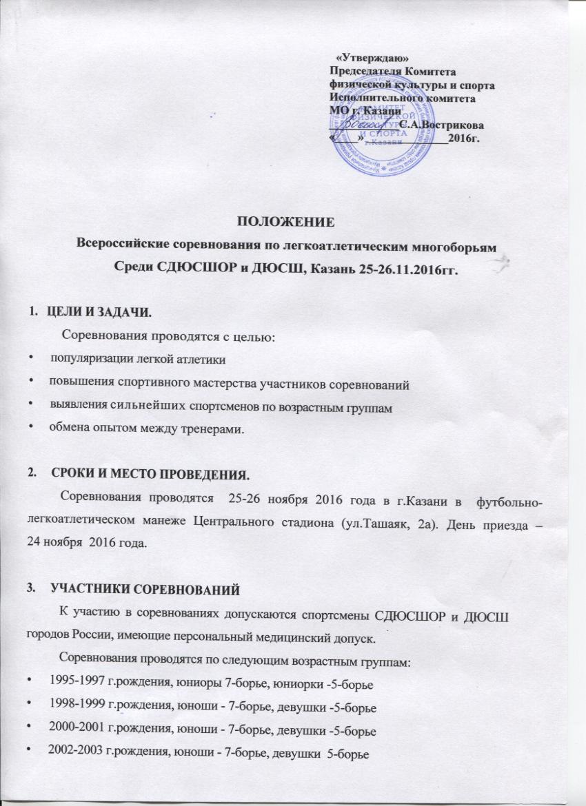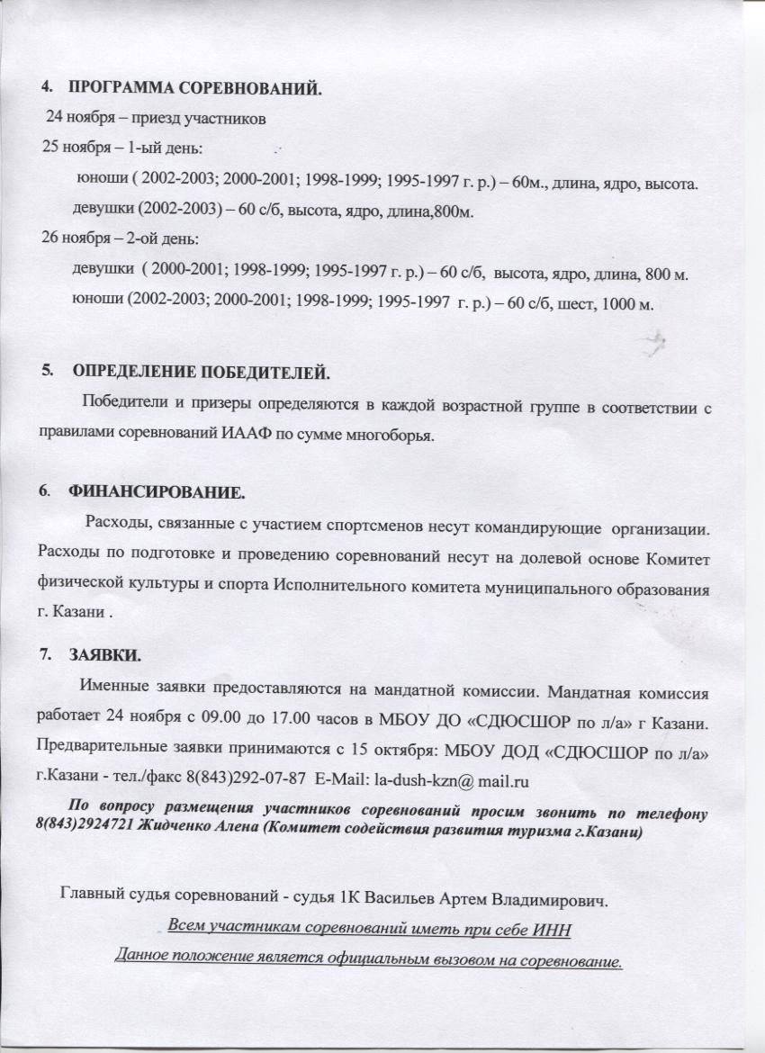 25-26 ноября в Казанском футбольно-легкоатлетическом манеже Центрального стадиона (Ташаяк, 2а) пройдут Всероссийские соревнования по легкоатлетическим многоборьям среди СДЮСШОР и ДЮСШ. День приезда участников - 24 ноября 2016. Вся подробная информация в положении →положение 004.jpg(стр1), положение 005.jpg(стр2), положение 006.jpg(стр3)