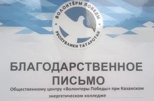 За активное участие в мероприятиях и проектах Татарстанского регионального отделения Всероссийского общественного движения "Волонтеры Победы", команда волонтеров Казанского энергетического колледжа (командир Иванов К., студент группа 28-11К) награждена Благодарственным письмом. Поздравляем ребят с успехом и пожелаем им еще более ярких и интересных мероприятий.