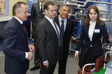 Его сопровождали заместитель Председателя Правительства РФ Аркадий Дворкович, полномочный представитель Президента РФ в Приволжском федеральном округе Михаил Бабич, министр образования и науки РФ Дмитрий Ливанов, Президент Татарстана Рустам Минниханов и другие официальные лица.