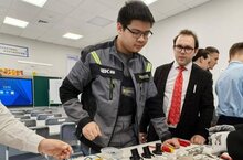 Затем Андрей Юрьевич со студентами гр. 13-01 Ле Туаном Ту и гр. 23-01 Фаткуллиным Данисом Альбертовичем провели профессиональные пробы для школьников по электромонтажным работам.