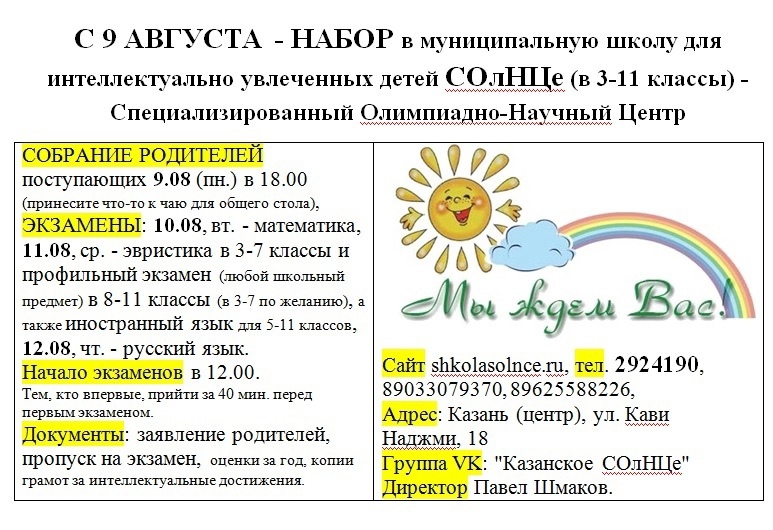 Набор в СОлНЦе: если Вы хорошо сдадите все 3 главных экзамена - мы пригласим вас в поход, и, может быть, зачислим. Если Вы ЛЕТОМ прекрасно сдадите 1 экзамен из 4-х или хорошо сдадите 2 из 3-х главных — пригласим на пробную учебу с 16.8. на 2 недели, и Вы можете показать себя учителям и учащимся. Но уже сейчас Вам (как поступающим, так и РОДИТЕЛЯМ) можно участвовать в творческом конкурсе.