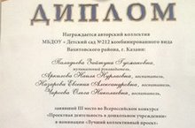 Авторский коллектив нашего детского сада : З.Г. Паладьева, Н.Н. Аркилова, Е.А. Назарова, О.Н. Чироева занял III место во Всероссийском конкурсе "Проектная деятельность в дошкольном учреждении" в номинации : "Лучший коллективный проект". Каждый из авторов награжден именным сертификатом и дипломом. Так держать!
